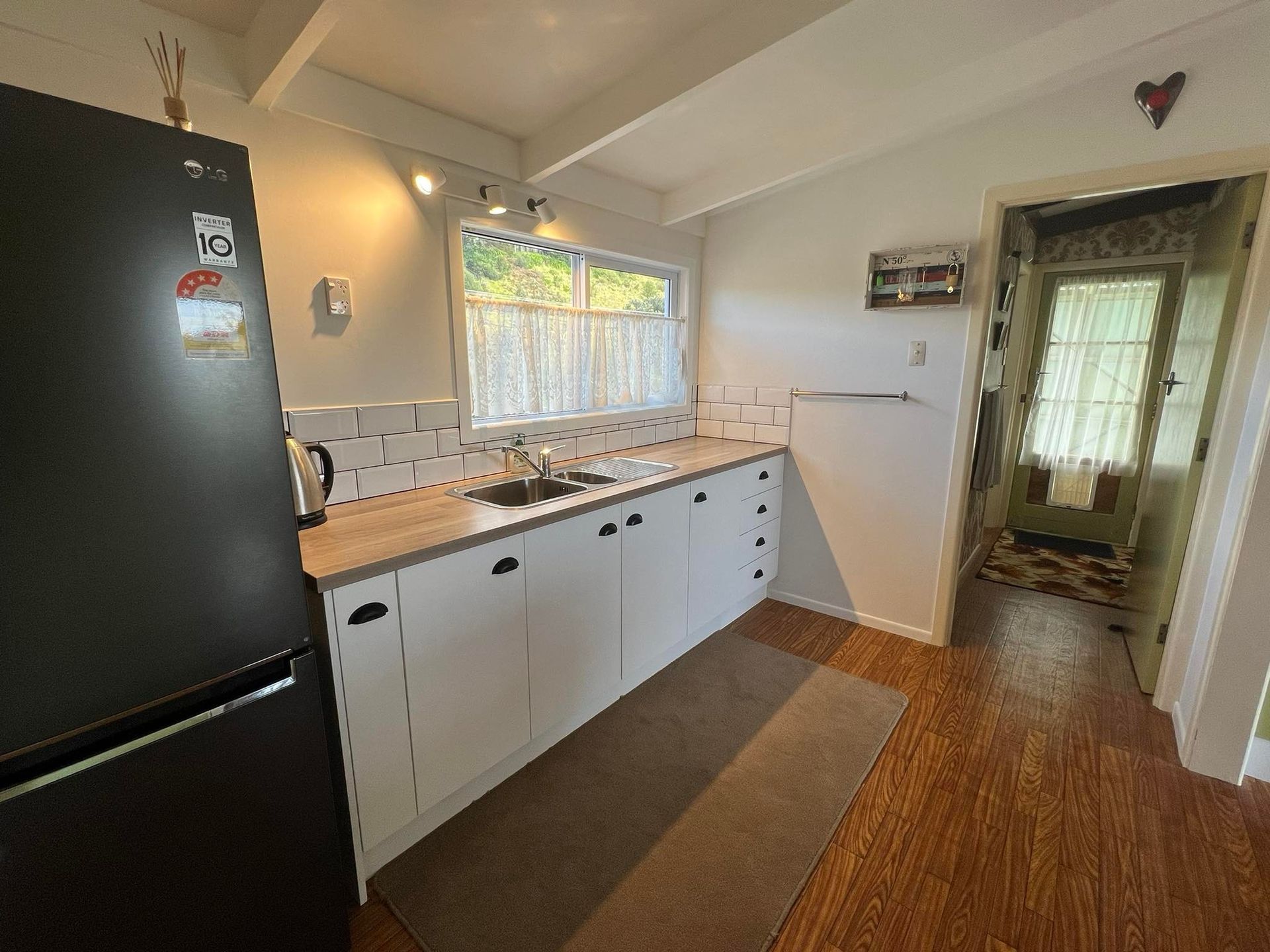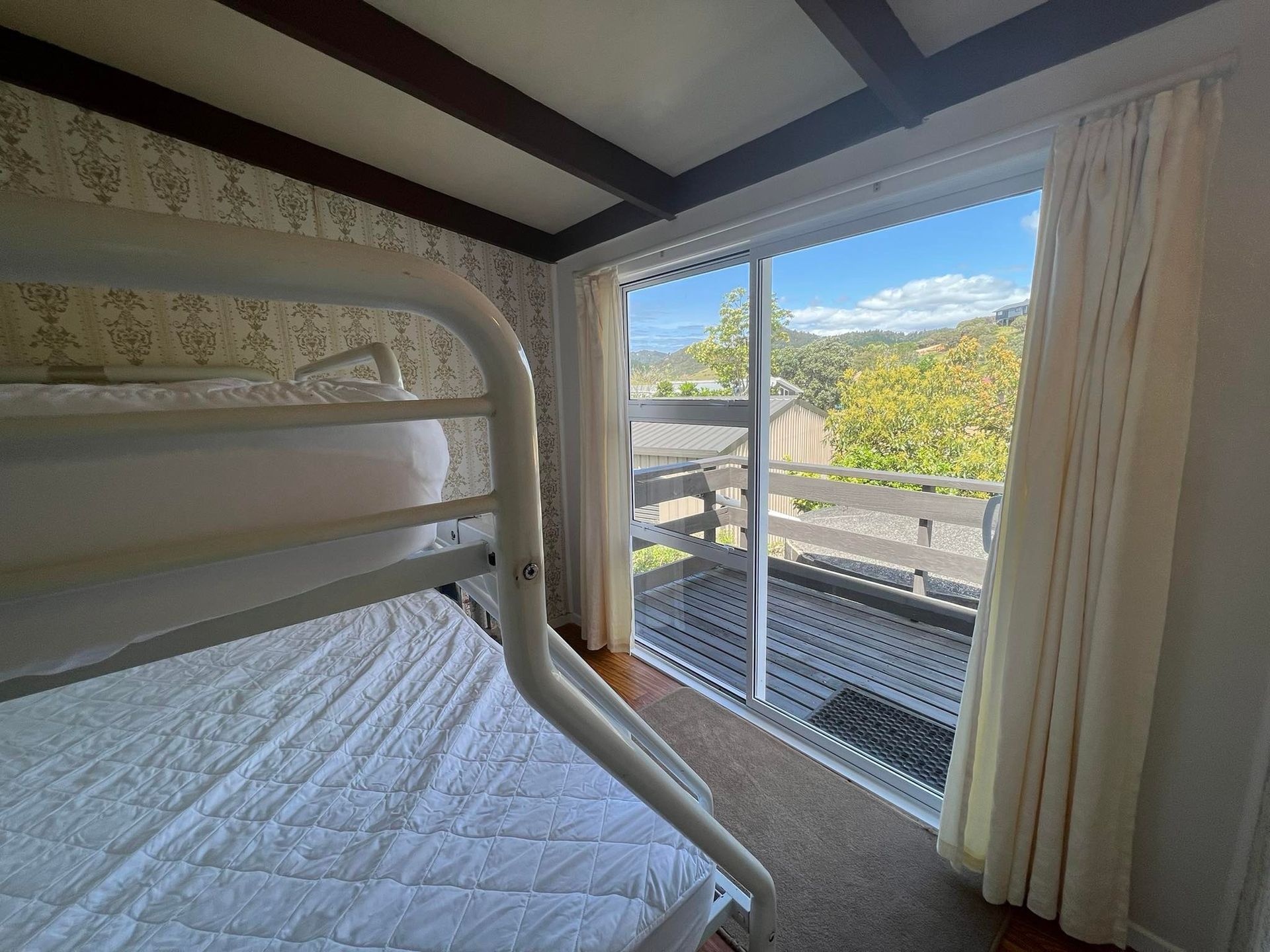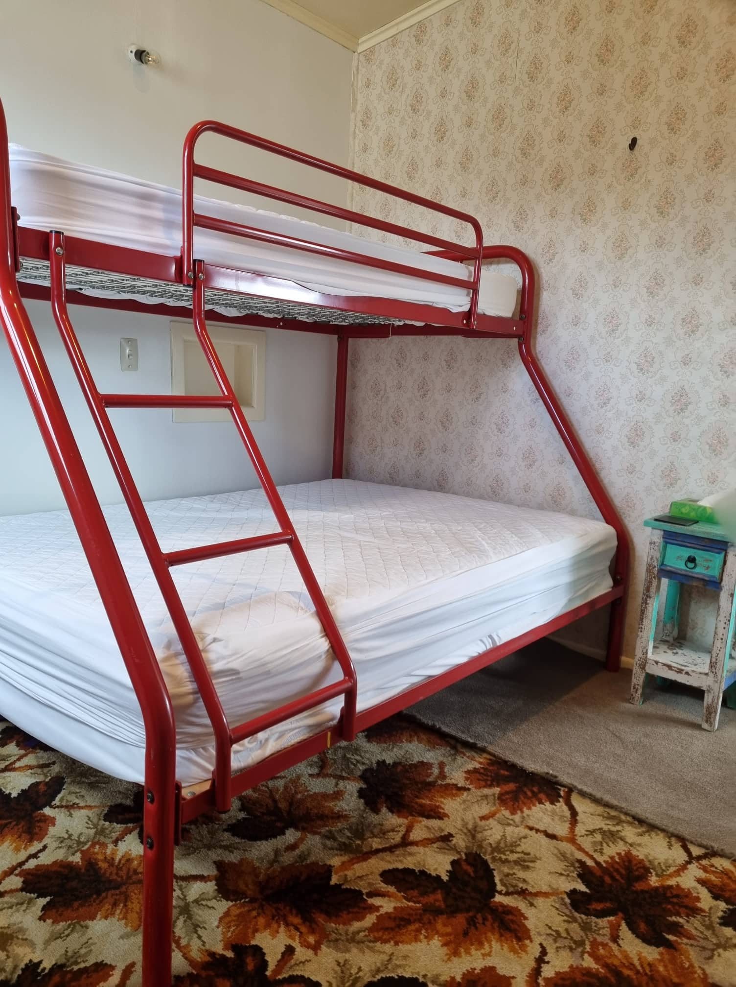 Situated at the back of the property, just off the kitchen, is the third bedroom. This double bed/single bed bunk bed combo, with your own private access to the back deck. USB socket and wall lights near the bed head. There is also some shelving available for your clothes and nicknaks!